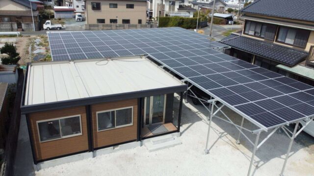 新規オープン事務所 掛川市 オフィス 施行日 2022年3月 場所 掛川市 施工内容 新規事務所オープン 新規オープン事務所正面入り口の隣にはカーポートとして利用できるようにソーラーパネルを設置しています。